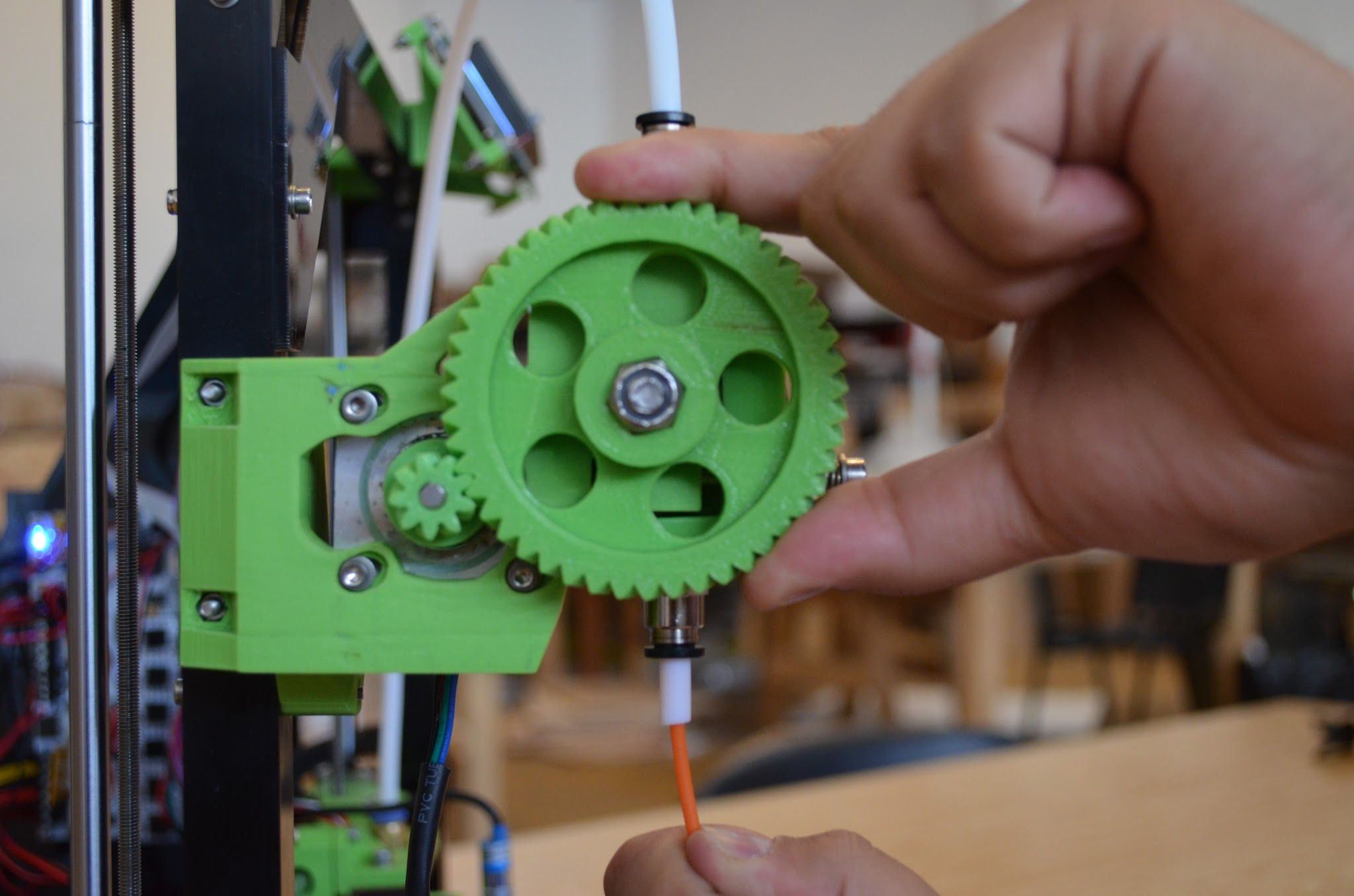 6.- Ya que este dentro del mecanismo tomemos el disco dentado y gírelo, sabrá que el filamento esta entrando cuando el tornillo muerda la punta del filamento.